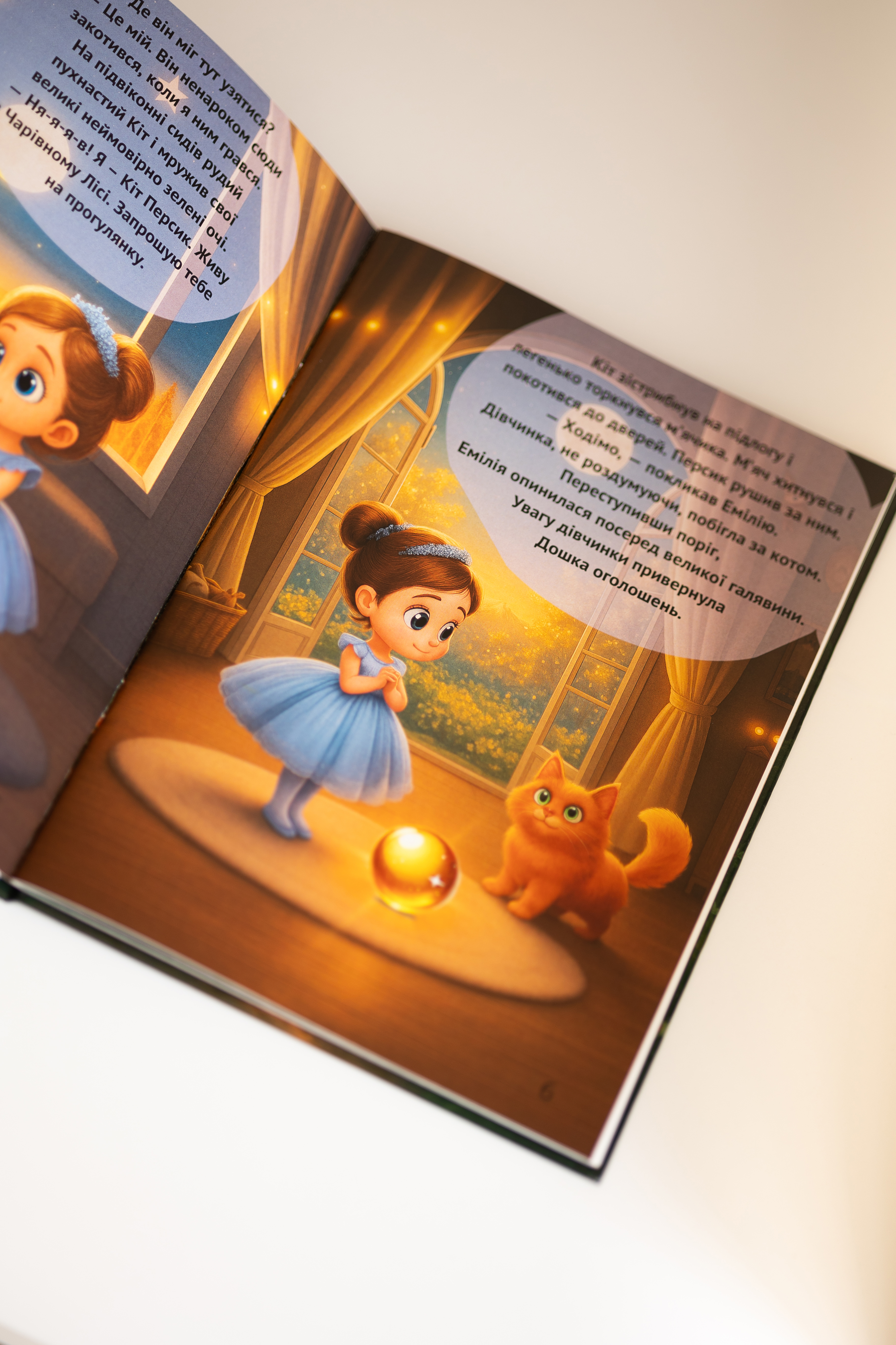 - Це чарівна іменна казка про дитину, яка знаходить золотий м’ячик і разом із чарівним котом вирушає до Чарівного Лісу. На неї чекають нові друзі, захопливі пригоди та теплі зустрічі з лісовими мешканцями. У своїй мандрівці дитина зустріне — зайчика, білочку, сову, гриби, ведмедиків, мурах, їжачка та інших. Історія сповнена магії та доброти й водночас лагідно навчає робити добрі справи, цінувати дружбу та вірити у власні маленькі дива.